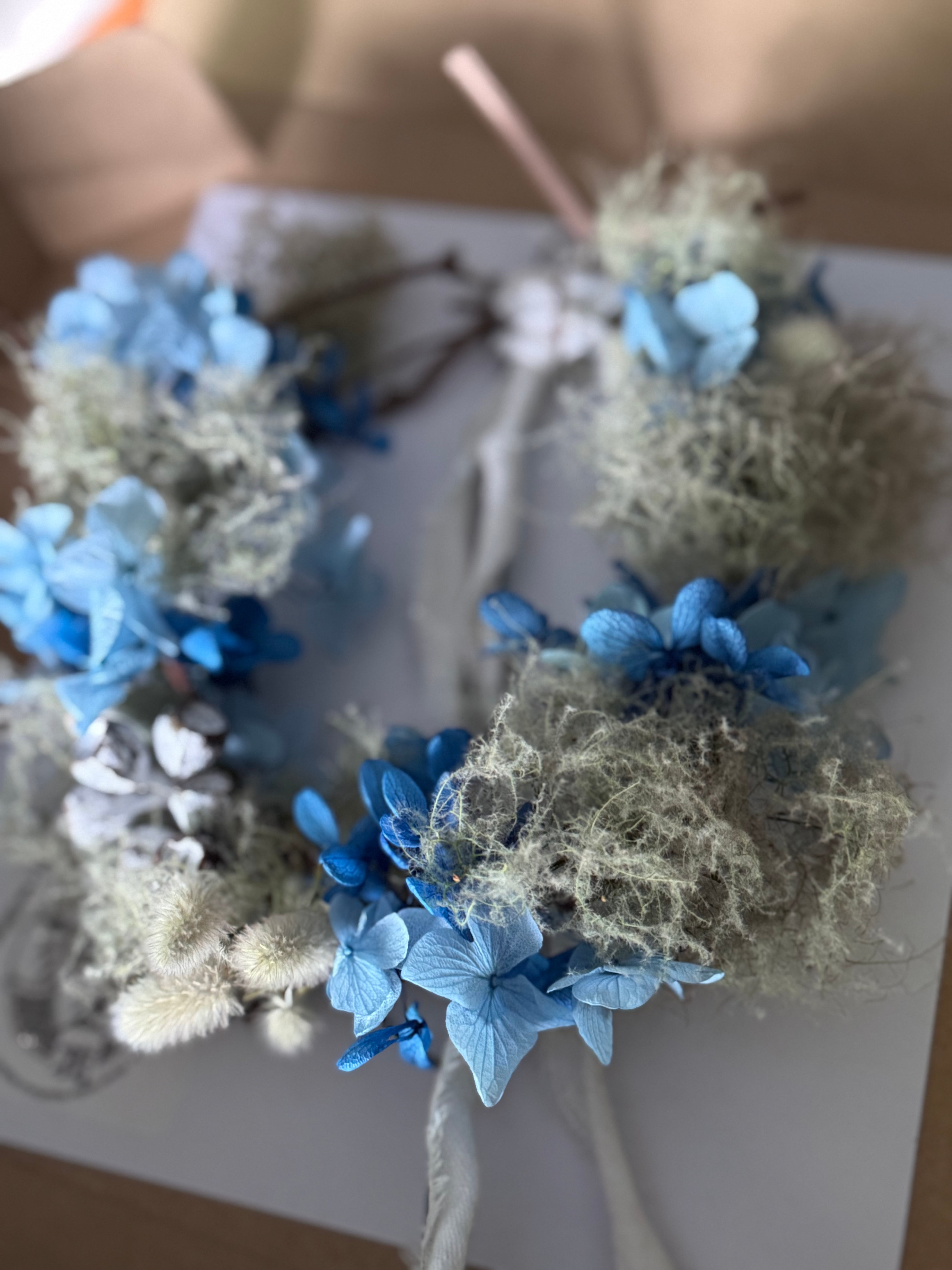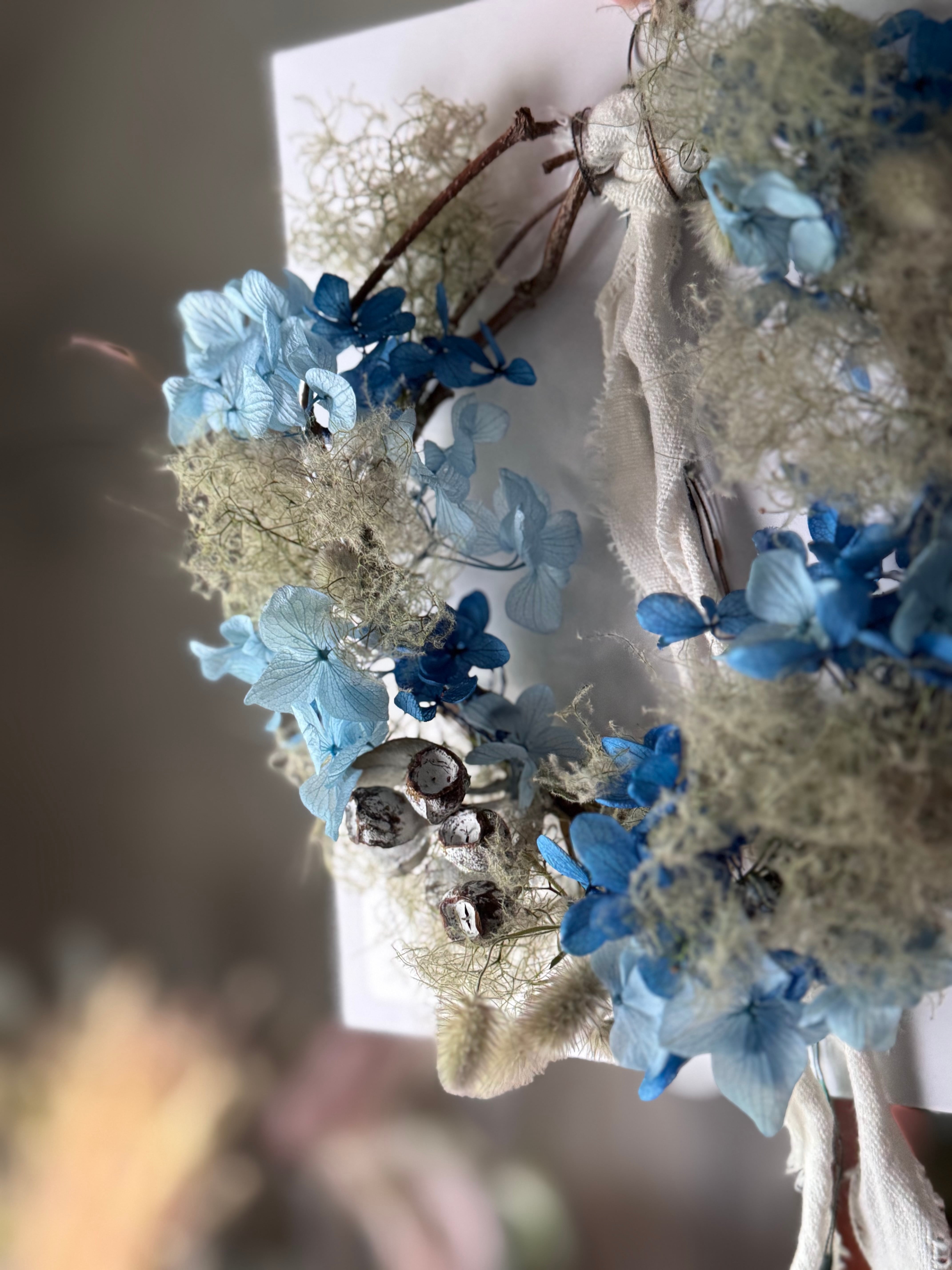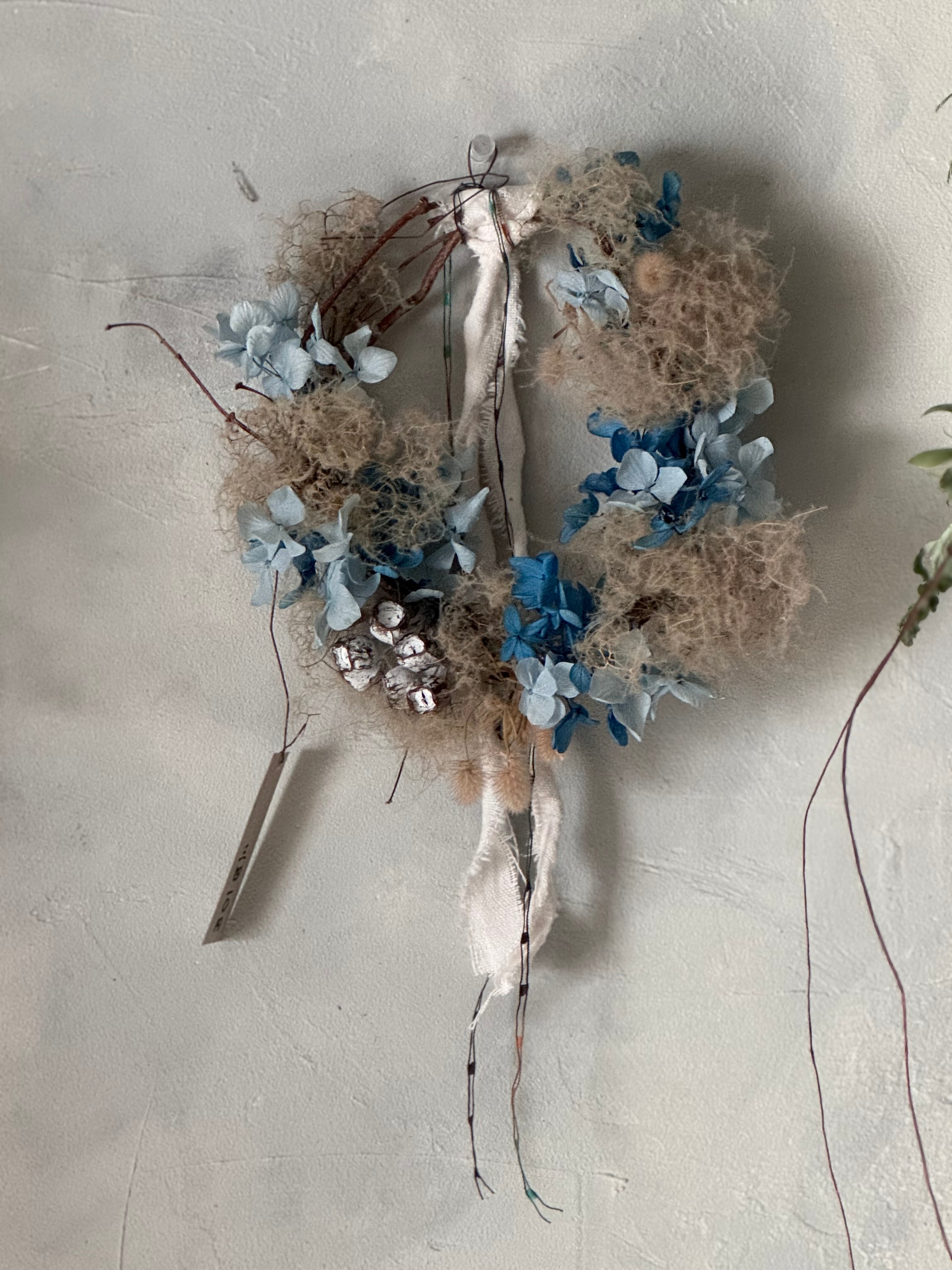 スモークツリーと紫陽花をメインに使用したリースになります。ブルーの紫陽花が爽やかな雰囲気で、特に夏にぴったりのリースだと思います。